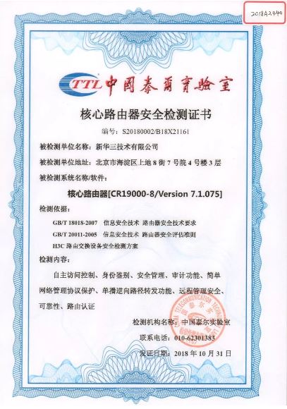 新華三CR19000-8核心路由器獲得泰爾系統(tǒng)實(shí)驗(yàn)室首張網(wǎng)絡(luò)設(shè)備安全檢測證書