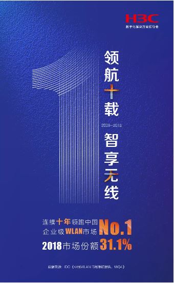 近日, 全球權威ICT市場研究機構IDC發布的《中國WLAN市場跟蹤報告,18Q4》顯示,紫光旗下新華三集團以31.1%的市場份額位居2018年中國企業級WLAN市場第一。從2009年到2018年,新華三已連續十年蟬聯中國企業級WLAN市場占有率第一,成為當之無愧的行業領袖,彰顯了新華三在WLAN領域領先的技術實力與始終如一的可靠品質。